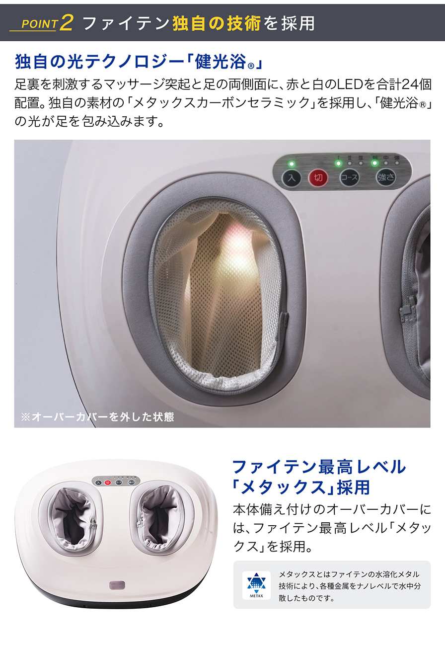 | ご注意 | ※血栓[そく(塞)栓]症、重度の動脈瘤、急性静脈瘤、各種皮膚炎および皮膚感染症(皮下組織の炎症を含む)などの理由により医師からマッサージを禁じられている方、足に疾患がある方、乳幼児やお子様は使用しないでください。 ※ペースメーカーなどの電磁障害の影響を受けやすい体内植込み型医用電気機器を使用している方、医師の治療を受けている方は、本商品を使用するに際して医師とご相談の上ご使用ください。 |