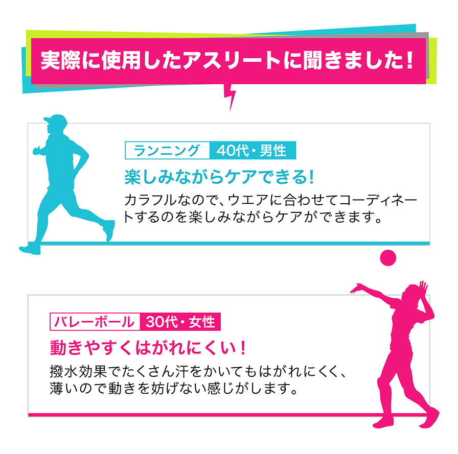 丸いシールと併用しています。丸いシールの上から貼ることもある。撥水加工ですが端っこからヒラヒラと剥がれてきてうざいですが、全体がすぐに剥がれることはないかなあと思います。足の裏やふくらはぎに貼ると足の疲れが違う気がする。