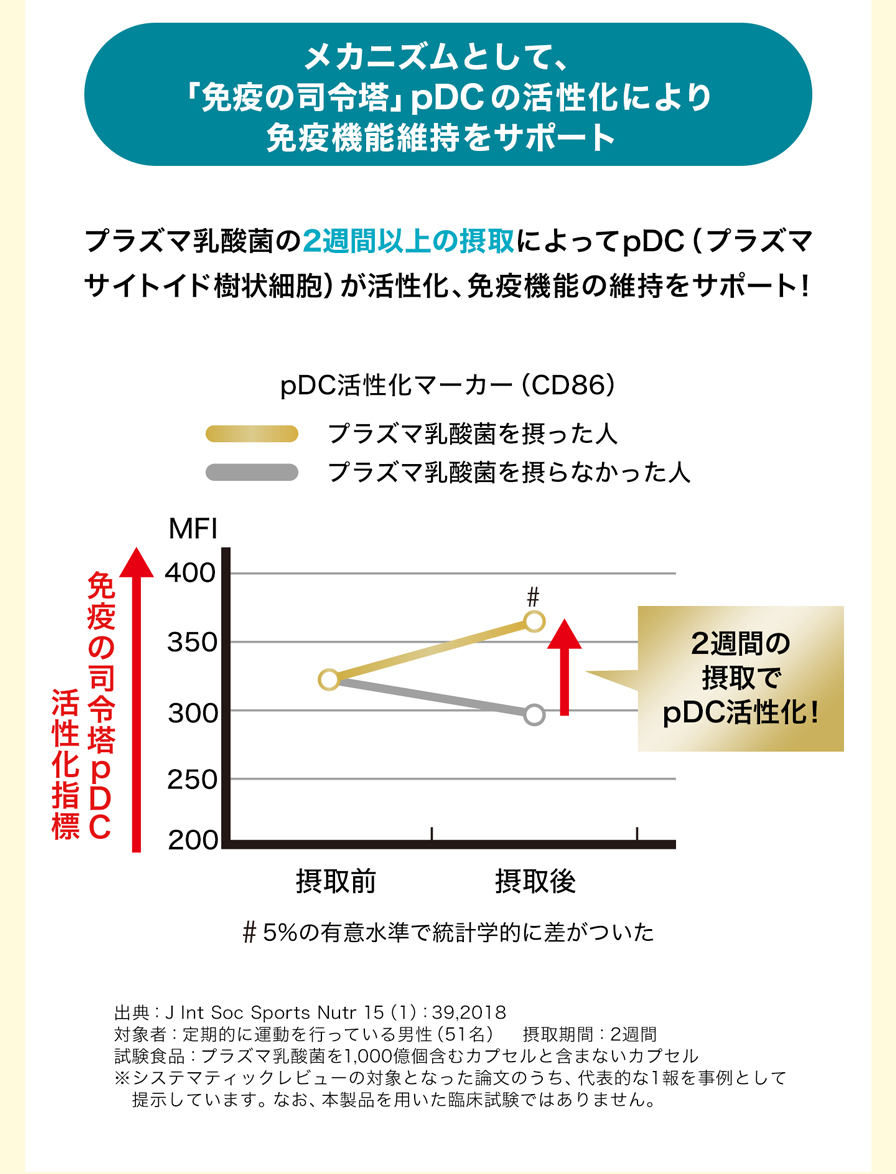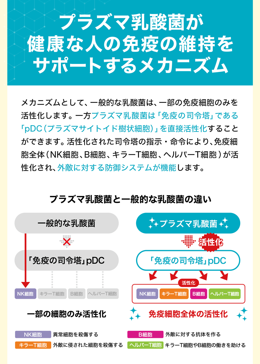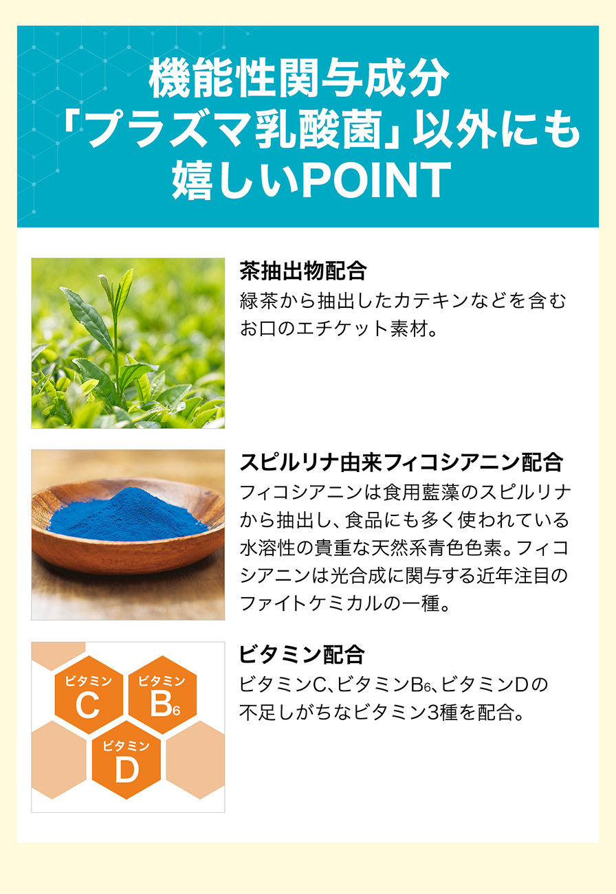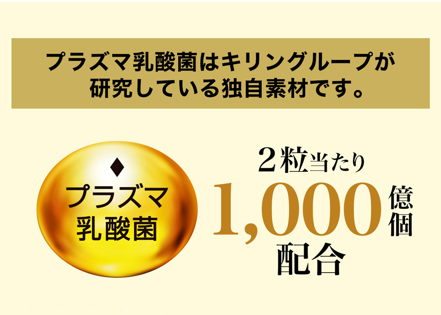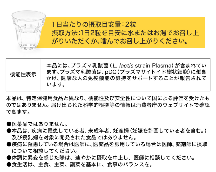 | 機能性関与成分 | プラズマ乳酸菌(L. lactis strain Plasma):1,000億個 |