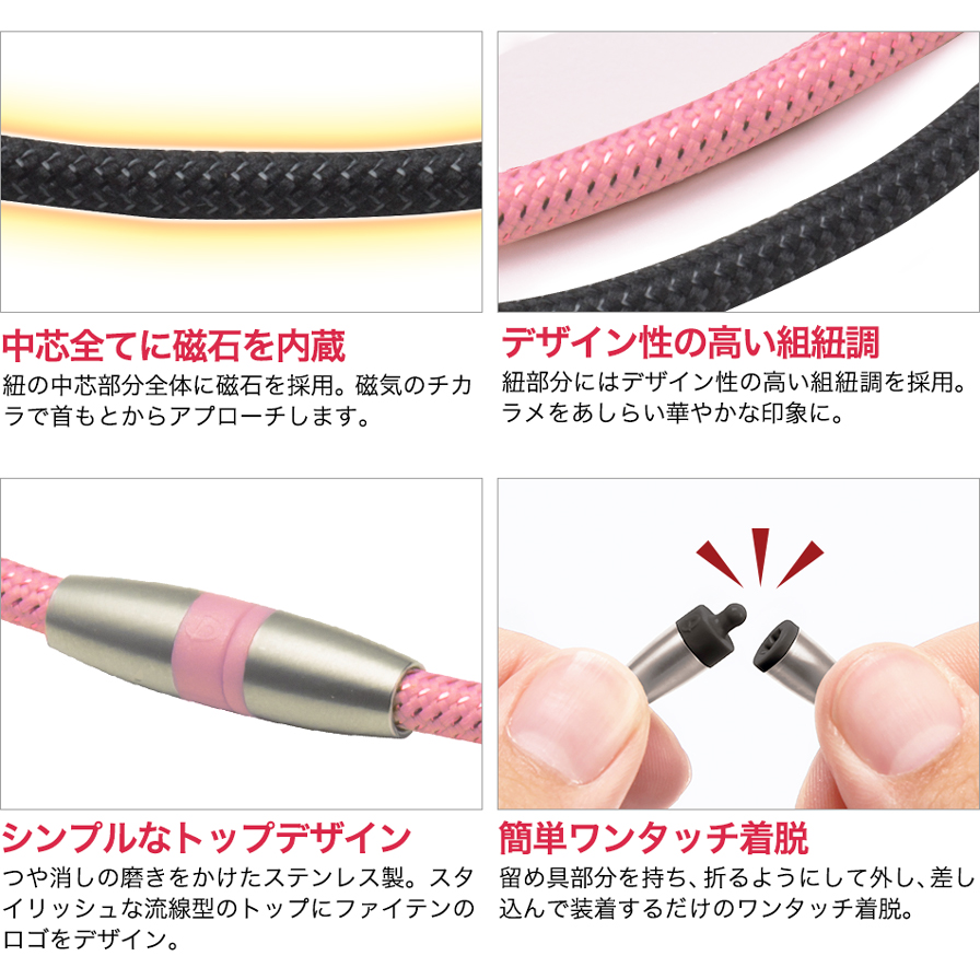 | 素材 | 本体生地:ポリエステル(ポリエステルラメ含む) 中芯:磁石 留め具:ステンレス、ポリアセタール |