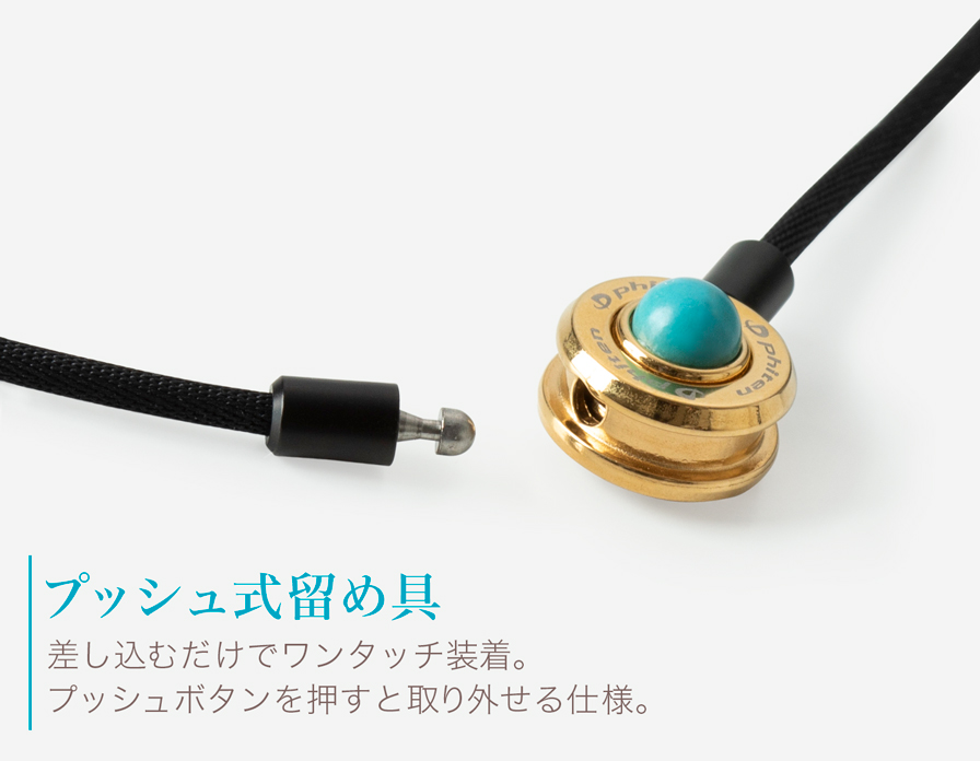 | 素材 | 紐部(側生地):ポリエステル73%、ナイロン27% 紐部(中芯):エラストマー 留め具:ステンレス、天然石(安定化処理)、ポリアセタール |