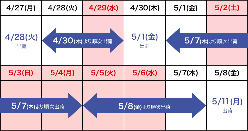 ゴールデンウィーク期間に伴い出荷スケジュールが変更となりますので下記出荷カレンダーをご確認の上ご注文ください。