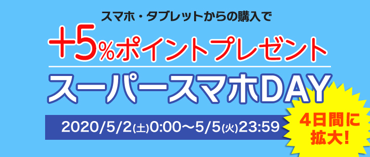 今月の得々スマホDAYは4日日間の拡大版!!5月2日(土)~5月5日(火)の期間中、スマホ・タブレットからご購入いただくだけで5%ポイントプレゼント致します。対象商品はオフィシャルストア内の全商品が対象!