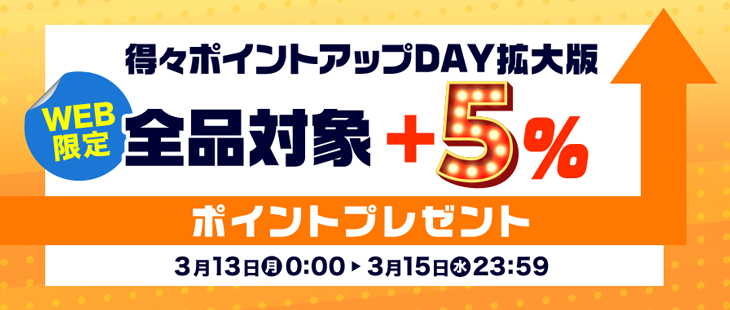 3月13日(月)~3月15日(水)の3日間の期間、さらにポイントアップの対象はオフィシャルストア内全商品。
