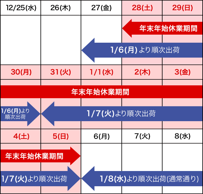 年末年始休暇に伴い出荷スケジュールが変更となりますので下記出荷カレンダーをご確認の上ご注文ください。